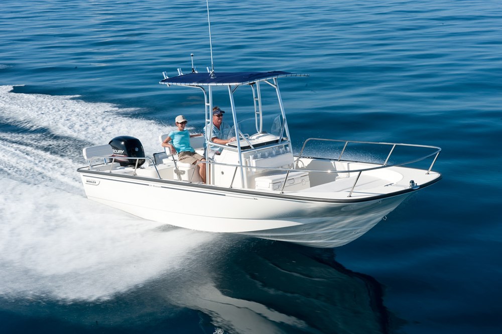 The Classic Boston Whaler Montauk is one of the most popular centre console boats around. Its simple but practical design and rugged build and the fact that it has a simple “hose and go” clean up, makes it ideal for regular use. It is one of the original Boston Whaler designs but there is more than meets the eye : below the water the shallow draft but typical hull shape makes it easy to get on the plane and give a dry soft ride. On deck the spacious design gives ample storage space and seating for all the family. Go Fishing, Go Wakeboarding or just Go!
